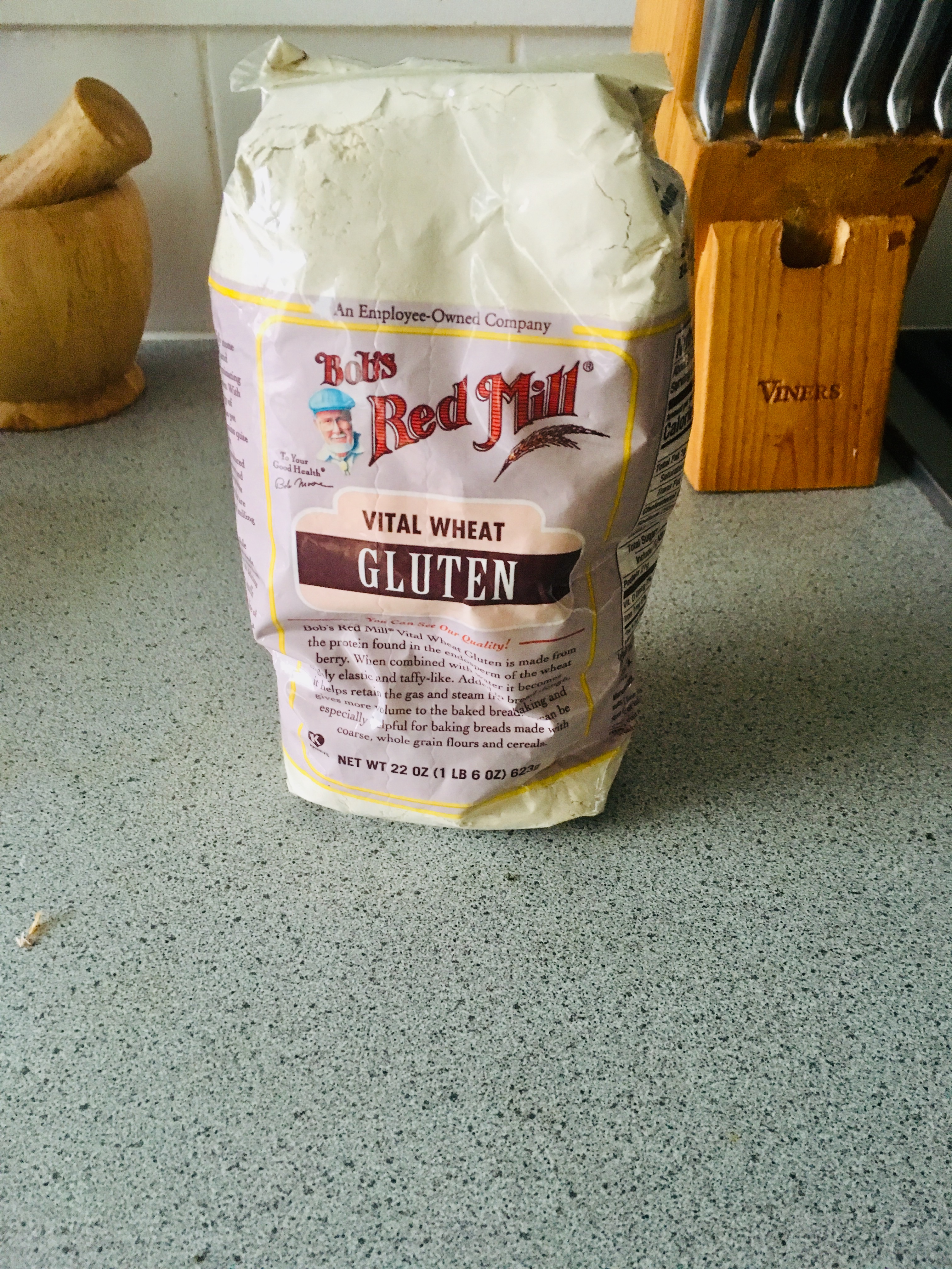 Secondly, gluten is a protein, however unlike most meats it contains only 8 of the 9 essential amino acids required to be useful as building material for human biology: it’s very low in lysine. So this means it should be eaten with foods higher in lysine or lysine should be added somehow – pulses are usually good for that. Indeed chickpeas (garbanzo beans) are high in lysine, so this recipe adds the lysine simply by including chickpea flour (gram flour). This also modulates the texture. Pure gluten is very very rubbery, the more chickpea flour (and/or water) one adds, the softer/foamier the resulting Seitan becomes.